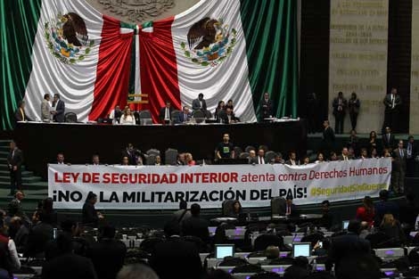 Al entrar la noche, sin que se permitiera cambio alguno al texto aprobado en la Comisión de Gobernación, se dio respuesta desde el PRI a la demanda del titular de la Secretaría de la Defensa Nacional Defensa, general Salvador Cienfuegos, quien desde hace más de un año demandó que se avalara en la ley la participación de las fuerzas armadas en tareas de seguridad.