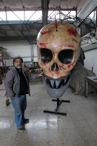 En su taller, ubicado en el amplio espacio de una imprenta en Tacubaya, el pintor también trabajó en otros 12 cráneos de pequeño formato, que acompañarán al grande y que posteriormente serán subastados.