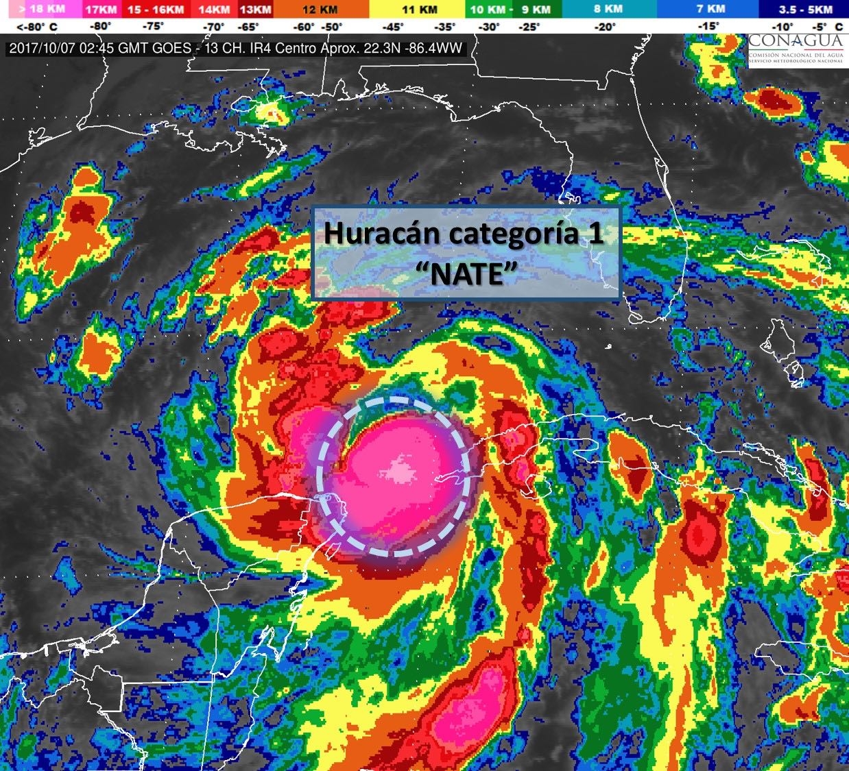 El huracán ‘[i]Nate[/i]’ mantiene una trayectoria hacia el nor-noroeste a una velocidad de 35 km/h. Se ubica a 110 kilómetros al noreste de Cabo Catoche, Quintana Roo.