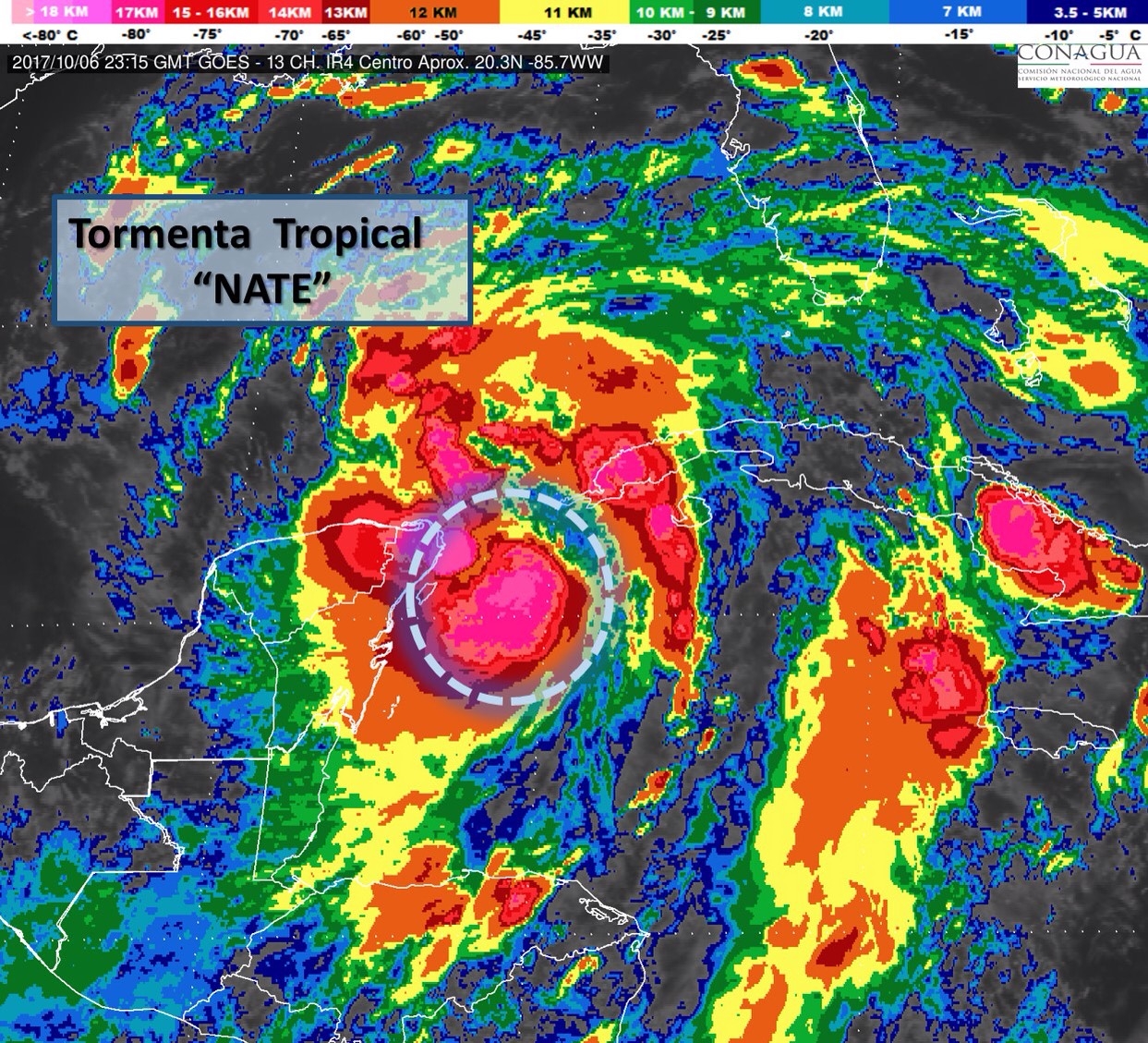 La noche de ayer, la tormenta tropical ‘[i]Nate[/i]’ se desplazó sobre el Canal de Yucatán a una velocidad de traslación de 35 kilómetros por hora (km/h) con dirección al noroeste para después ingresar al Golfo de México, informó la Comisión Nacional del Agua (Conagua), a través del Centro Hidrometeorológico Regional de Mérida (CHRM) del Servicio Meteorológico Nacional (SMN).