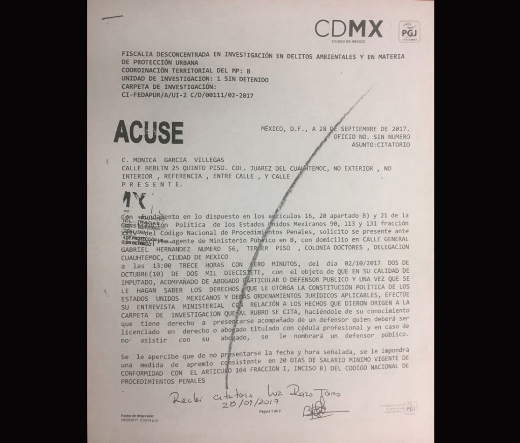 El citatorio, girado por la Fiscalía Desconcentrada en Investigación en Delitos Ambientales y en Materia de Protección Urbana, está relacionado con la carpeta de investigación CI-FEDAPUR/A/UI-2, que está consignada en la unidad de investigación “sin detenido”, y fue hecho llegar a la calle Berlín 25, quinto piso, colonia Juárez, en la delegación Cuauhtémoc.