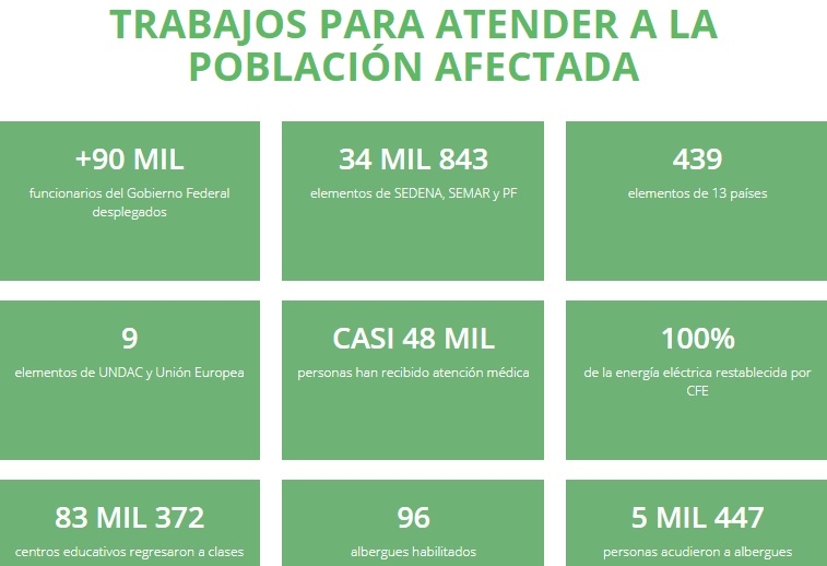 En cuanto a la población, se informa que 74 mil 269 centros educativos regresaron a clases; 14 mil 689 acudieron a albergues y 400 municipios o delegaciones fueron declarados en emergencia extraordinaria.