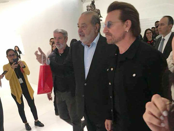 El vocalista y líder de la banda irlandesa U2, Bono, recorrió esta mañana el Museo Soumaya en compañía del empresario mexicano Carlos Slim Helú.