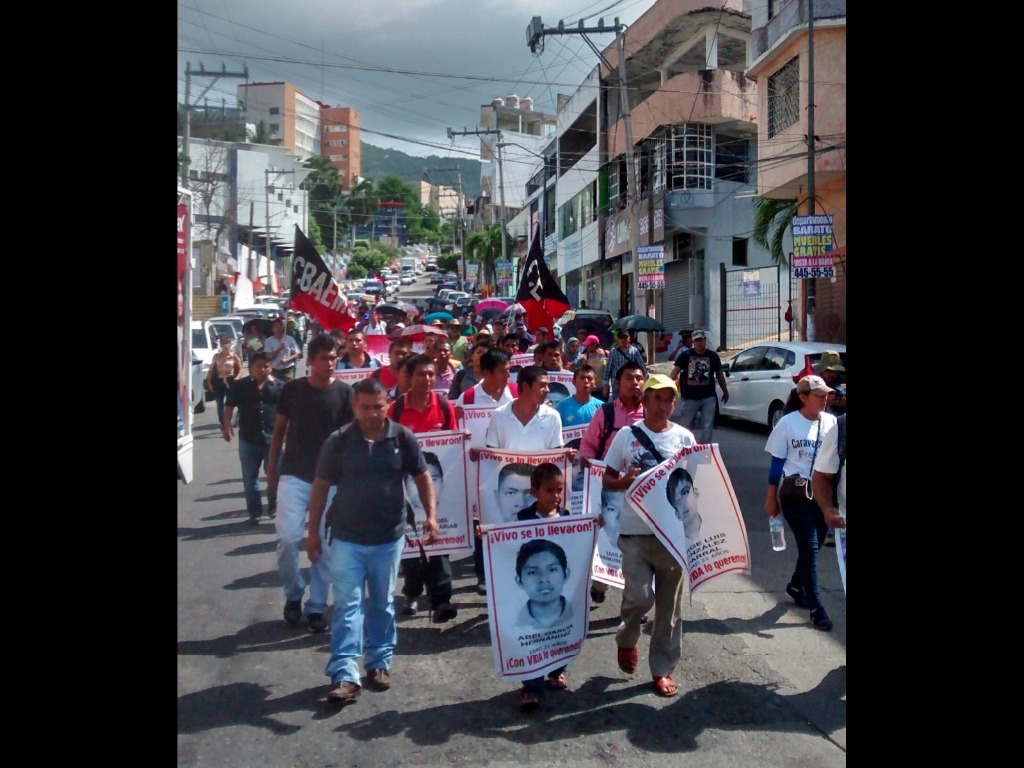 Normalistas de la escuela Normal Rural Raúl Isidro Burgos, familiares de los 43 normalistas desaparecidos desde el 26 y 27 de septiembre de 2014 y docentes de diferentes corrientes magisteriales marchan desde la unidad académica de Contaduría y Administración de la Universidad Autónoma de Guerrero, rumbo a la franja turística de Acapulco.