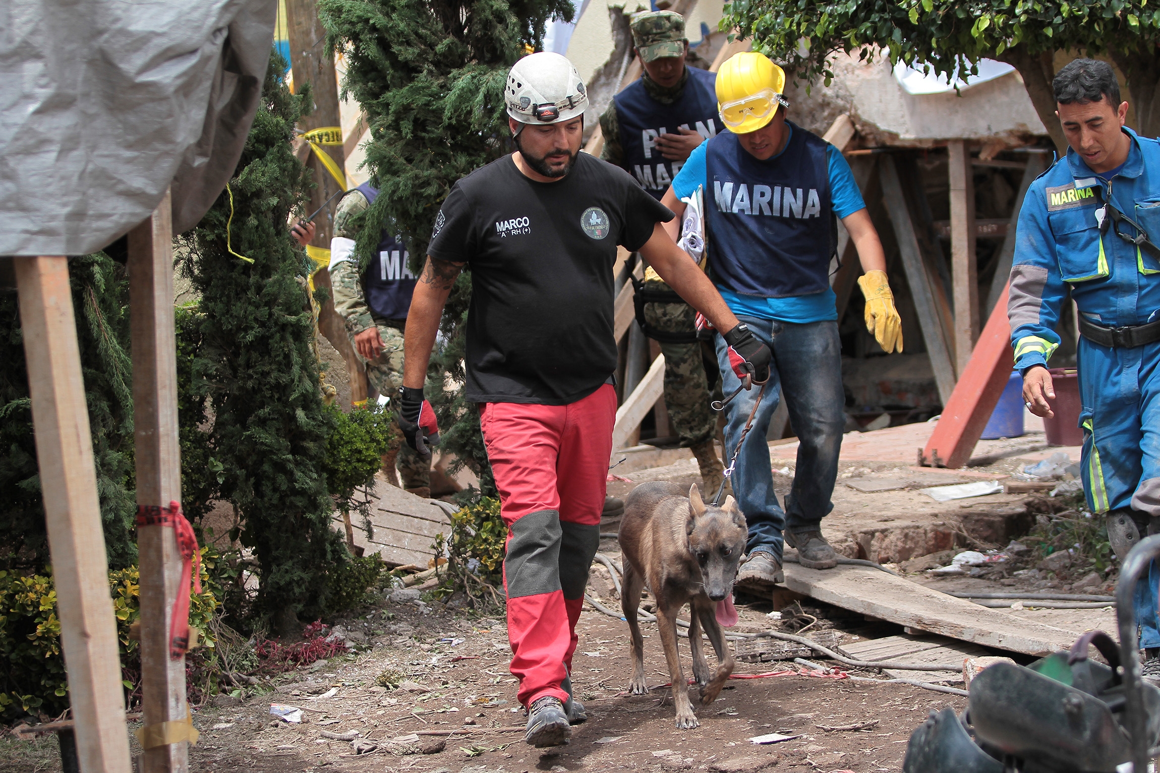 Con los puños a lo alto se dio la orden y todos interrumpieron sus labores para guardar silencio; apenas le soltaron la correa, [i]Koi[/i] se dirigió a los escombros del edificio colapsado del Colegio Enrique Rébsamen en busca de sobrevivientes del sismo del martes pasado.