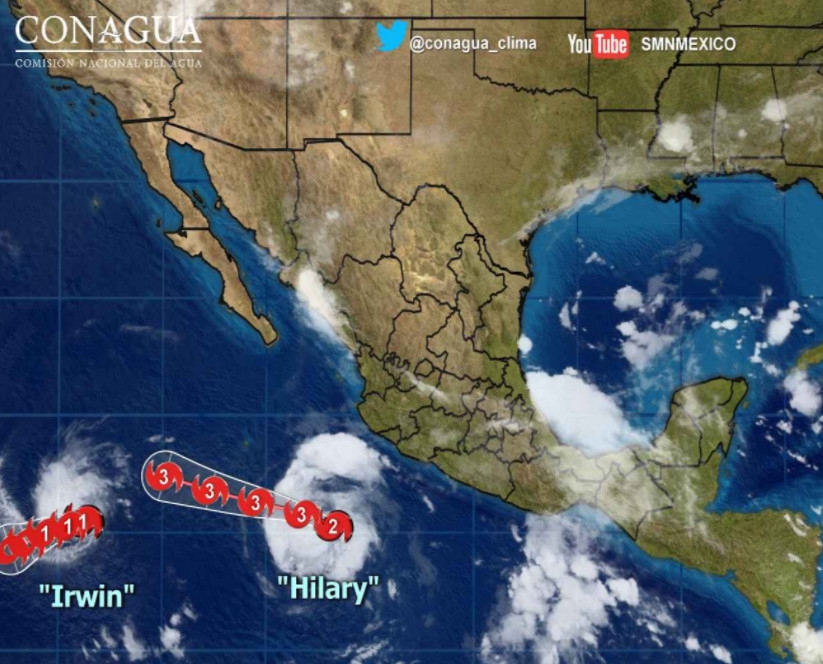 El Servicio Meteorológico Nacional (SMN) informó que el huracán Hilary, de categoría 2 en la escala Saffir-Simpson, aumenta gradualmente su fuerza y mantiene su desplazamiento hacia el oeste-noroeste.