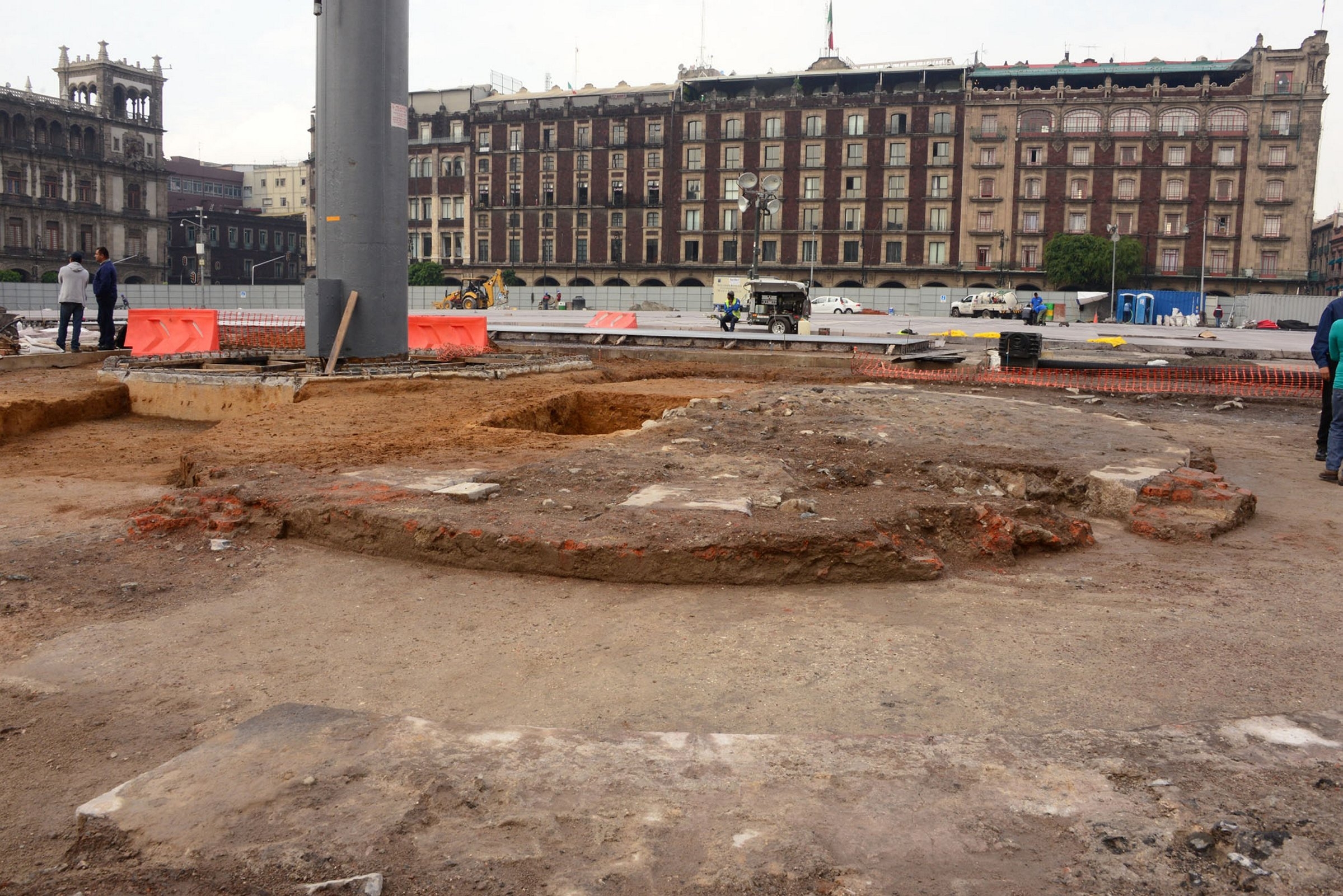A través de la supervisión arqueológica del proyecto de rehabilitación de la Plaza de la Constitución, el equipo de la Dirección de Salvamento Arqueológico (DSA) del INAH detectó el basamento de ocho metros de diámetro y 28 centímetros de altura, rodeada por un patio circular de tres metros de ancho, al norte del asta bandera.