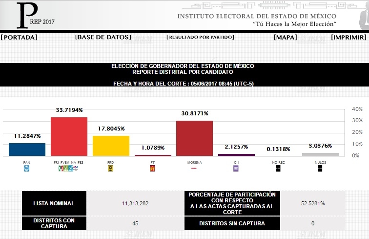 El último de los 45 consejos distritales en contabilizar los votos de la jornada comicial del domingo 4 de junio fue el 23 de Izcalli, que terminó su labor durante la madrugada. Por la mañana se cumplió todo el protocolo de firmas de actas y de enviar copia de los resultados al Consejo General del Instituto Electoral del Estado de México (IEEM).
