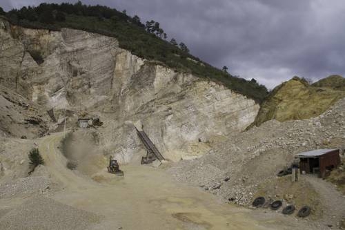 Desde lejos se aprecian enormes huecos y manchas blancas en los cerros (el de Santa Cruz fue cortado por la mitad), prácticamente destruidos por máquinas, picos y palas, así como por el constante paso de camiones cargados de material.