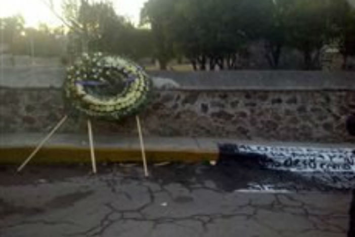 Una manta en la cual amenazan a Andrés Manuel López Obrador, dirigente nacional del partido Morena, firmada por [i]La Familia Unida,[/i] además de una corona de flores y un vehículo incendiándose fueron colocados en las inmediaciones del ex convento de Acolman.
