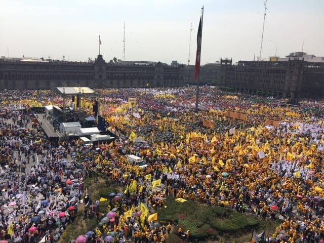 Miles de perredistas se concentran en la plancha del Zócalo. Raúl Flores, dirigente capitalino, señaló que "el Zócalo está abarrotado... el PRD está más vivo que nunca. El PRD vienen a hablarle no a un hombre, sino a la nación... Gracias por seguir con fidelidad al PRD".