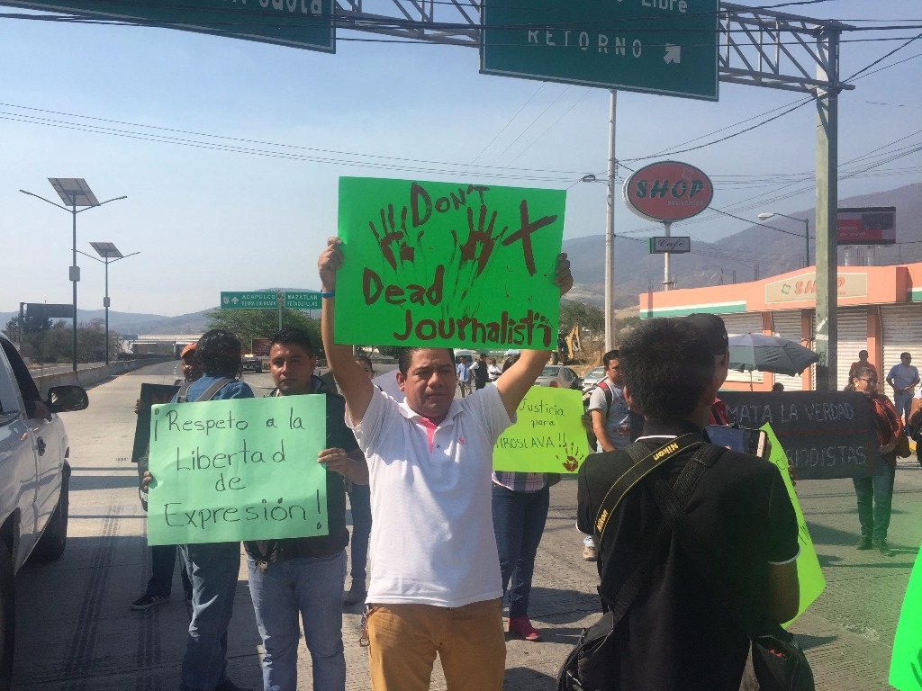 Medio centenar de reporteros realizaban esta mañana un bloqueo en la Autopista del Sol, México-Acapulco para protestar por el crimen de la corresponsal de [i]La Jornada[/i] Miroslava Breach, así como de Ricardo Monlui y Cecilio Pineda, ejecutados en distintas partes del país el pasado mes de marzo.