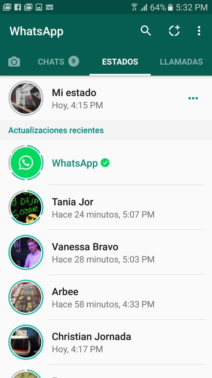 La aplicación de mensajería WhatsApp agregó a su plataforma la función "estatus", la cual permite a los usuarios informar a sus contactos qué están haciendo en ese momento. Los usuarios podrán poner fotos o videos en sus actualizaciones de estado.