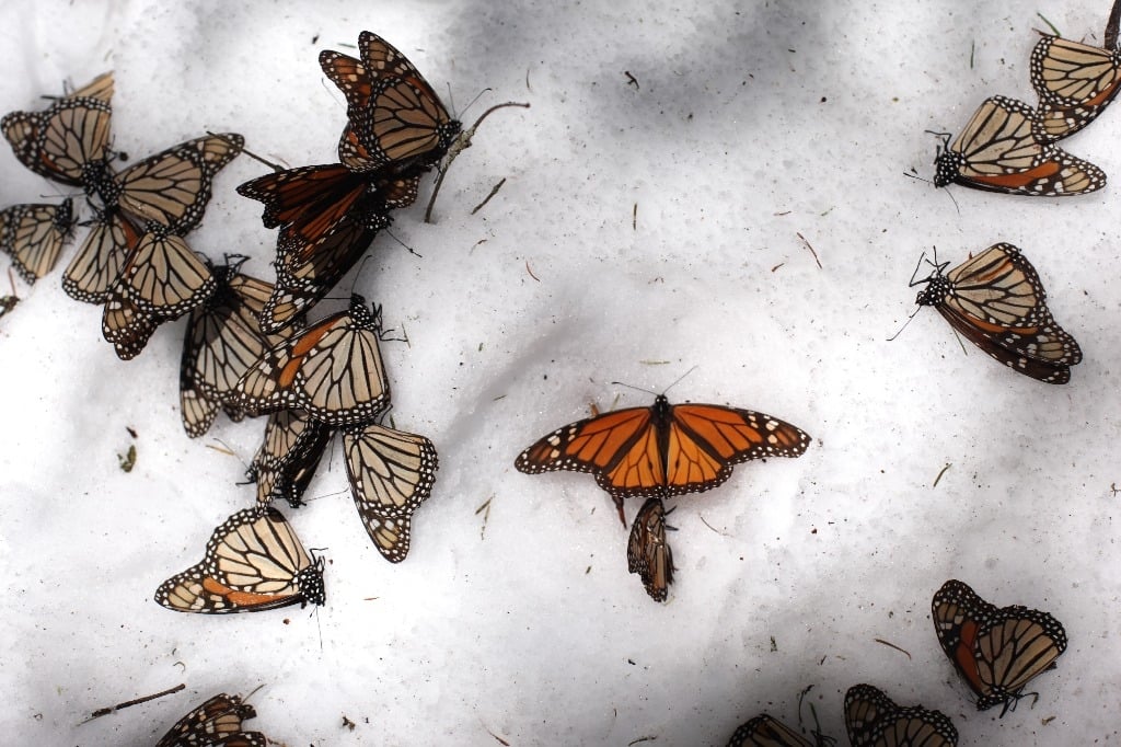 La población de la mariposa monarca se redujo en aproximadamente 35 por ciento este año, debido a la tormenta de nieve del 9 de marzo del año pasado, tres fuertes heladas y vientos que destruyeron unos tres mil árboles, afirmó Homero Gómez, comisariado ejidal del ejido El Rosario, sitio donde se ubica el cerro El Campanario, donde arriba el 50 por ciento de toda la mariposa que llega a Michoacán.