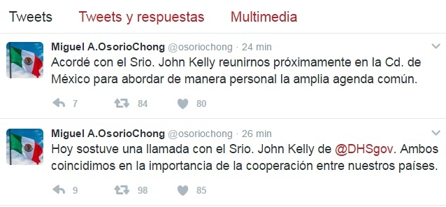 El secretario de Gobernación de México, Miguel Ángel Osorio Chong, y el secretario de Seguridad Interior de los Estados Unidos, General John F. Kelly, hablaron hoy, vía telefónica, y acordaron fomentar una relación constructiva.