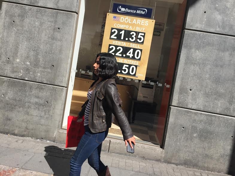 El tipo de cambio se situó al medio día en 21.50 pesos por dólar a la compra y 21.95 pesos a la venta, 15 centavos menos que a la apertura de los mercados.