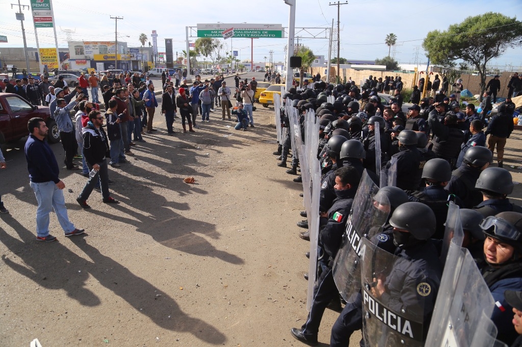 Allí empezó el primer forcejeo. La policía les lanzó gases lacrimógenos y los manifestantes respondieron con piedras. Más tarde hubo otros roces, por lo que 100 policías municipales de Tijuana llegaron de apoyo. El helicóptero Pegaso de la policía estatal preventiva sobrevolaba el lugar.