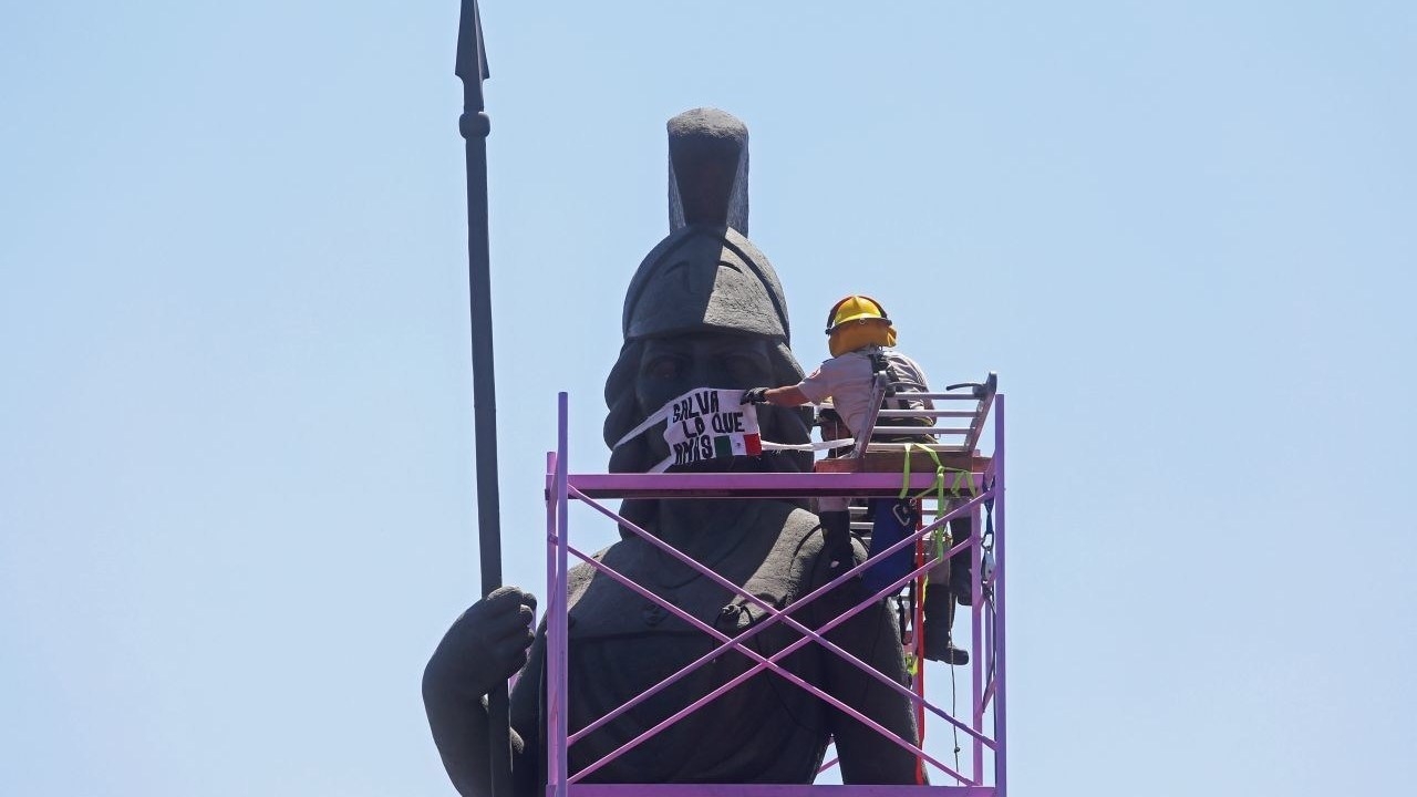 Con la ayuda de un andamio, un elemento de Protección Civil y Bomberos colocó el cubrebocas gigante color blanco, similar al que impusieran también a las esculturas de Miguel Hidalgo en la Plaza Liberación, en el centro de Guadalajara y la Madre Patria, en Plaza de la República.