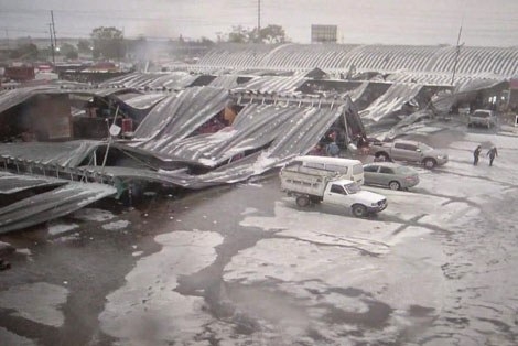 La fuerte lluvia y caída de granizo atípico en el oriente de la Ciudad de México ocasionó el colapso de tres naves en el sector de flores y hortalizas de la Central de Abasto (Ceda), ubicada en Iztapalapa, que dejó dos personas heridas, una por traumatismo craneoencefálico moderado y la segunda por dorsolumbalgia. Asimismo, servicios de emergencia atendieron a otras tres por crisis nerviosas.