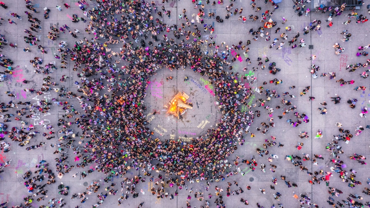 Varias asistentes seguían realizando pintas en muros de la Catedral Metropolitana y encendieron una enorme fogata donde lanzaban botes de pintura que salían disparados cuando explotaban. También colocaron en el asta una bandera negra.