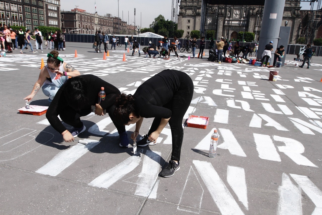 Un grupo de activistas en defensa de los derechos de las mujeres pintaron en la plancha del Zócalo capitalinas nombres de mujeres que han sido asesinadas de 2016 a la fecha.