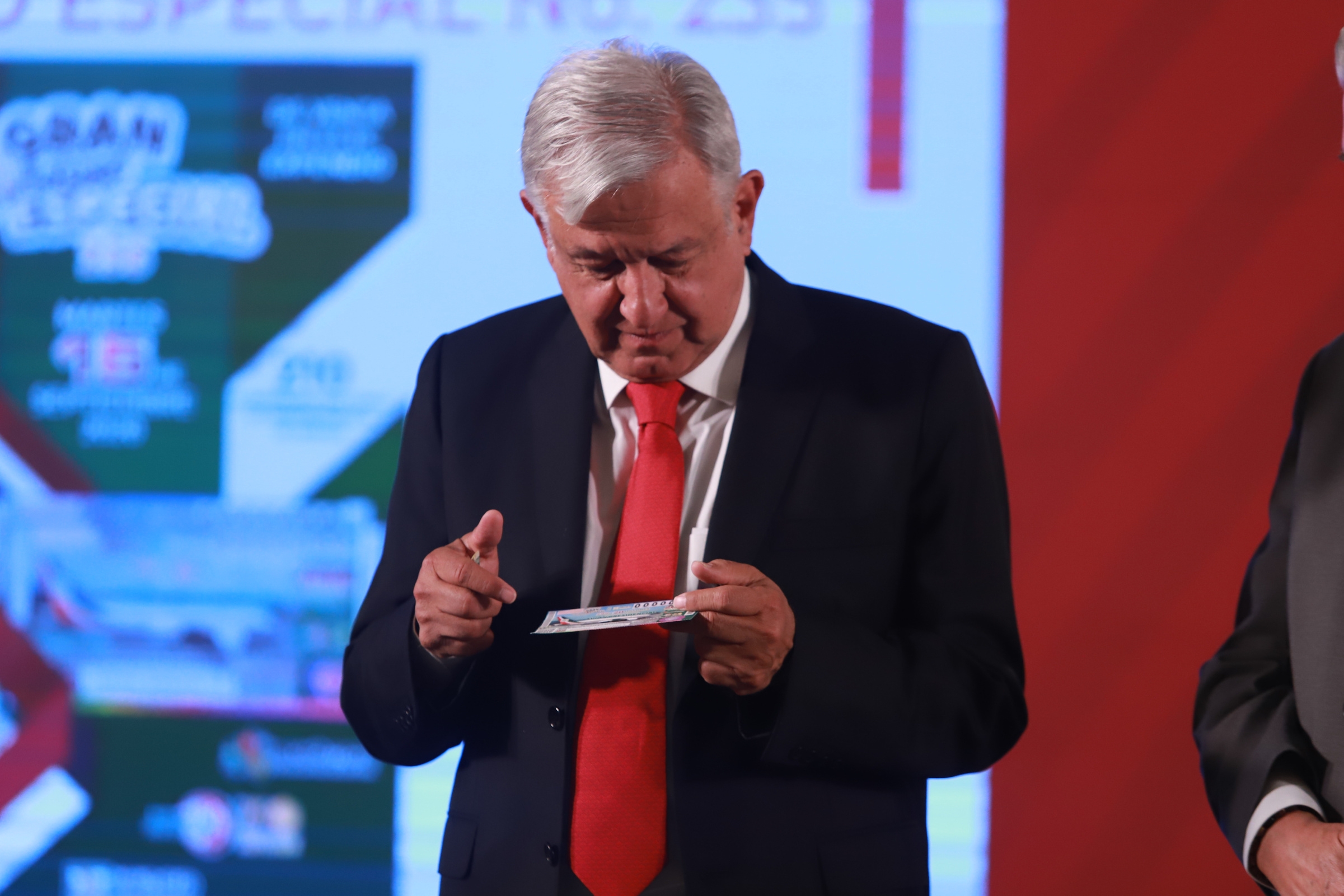 El presidente Andrés Manuel López Obrador compró el primer boleto para la rifa del premio de dos millones, que es equivalente al costo del avión presidencial, el cual pagó a Ernesto Prieto Ortega, director General de Lotería Nacional y Pronósticos para la Asistencia Pública (Lotenal).