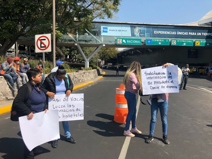 Familiares de niños con cáncer, pacientes del Hospital Infantil de México Federico Gómez bloquearon la avenida principal de acceso a la Terminal 1 del Aeropuerto Internacional de la Ciudad de México. Exigen al gobierno federal abastecimiento de medicamento.
