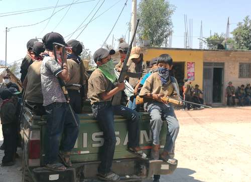 Luego se le otorgó la palabra a un niño, que con su escopeta terciada al hombro improvisó su discurso: “A los medios, a las autoridades gubernamentales; al pueblo de México, al mundo entero. Ya llevamos 15 meses que nos presentamos en la comunidad de Alcozacán, municipio de Chilapa de Álvarez. Estamos aquí para exigir al presidente Andrés Manuel López Obrador, que nos acusó de ser delincuentes, y le volvemos recordar que no; somos niños comunitarios y apoyamos en el resguardo de nuestra comunidad nahua. Una vez más exigimos que apoye a nueve viudas, a 14 huérfanos y a 34 indígenas desplazados de la comunidad de Acotapaxtlán, por culpa del grupo delictivo Los Ardillos. Ya basta de tanta delincuencia y discriminación a los indígenas de México”.