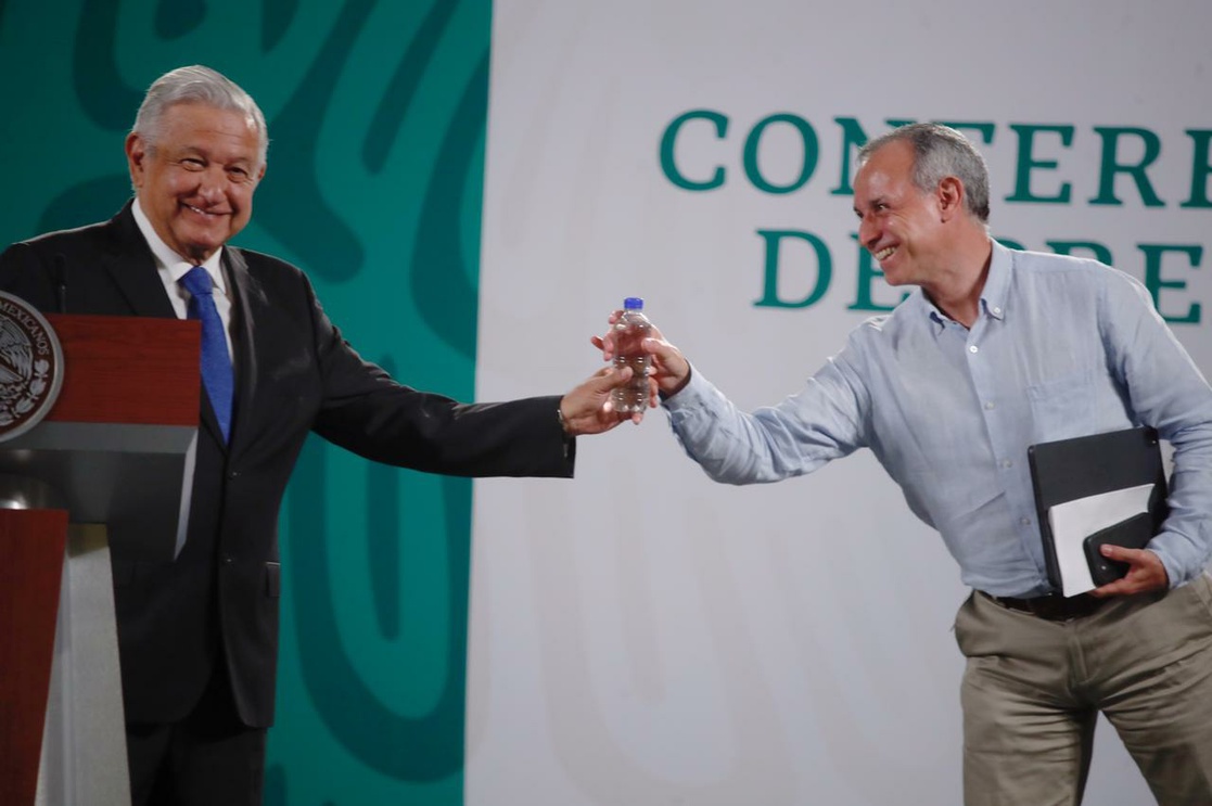 En su exposición durante la conferencia matutina, el funcionario tosió en varias ocasiones y ante el comentario de una reportera que deseaba que el subsecretario estuviera bien, el presidente Andrés Manuel López Obrador sonrió y le pasó una botella de agua a López-Gatell.