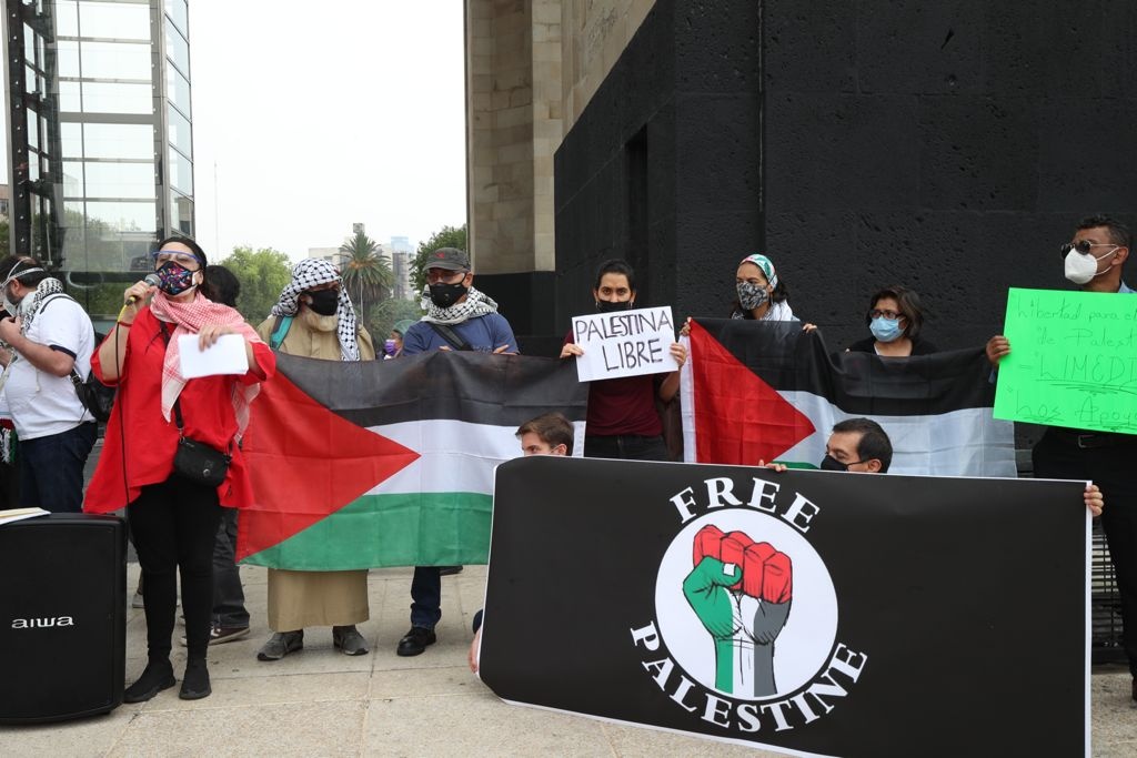 Desde las 15:00 horas, varias decenas de personas se congregaron en la explanada del monumento a la Revolución, donde declararon su solidaridad con la causa de los palestinos a través de pancartas y consignas como “no es un conflicto es un genocidio”, “abajo el muro de segregación, Palestina libre sin ocupación” y “a romper, a romper relación con Israel.