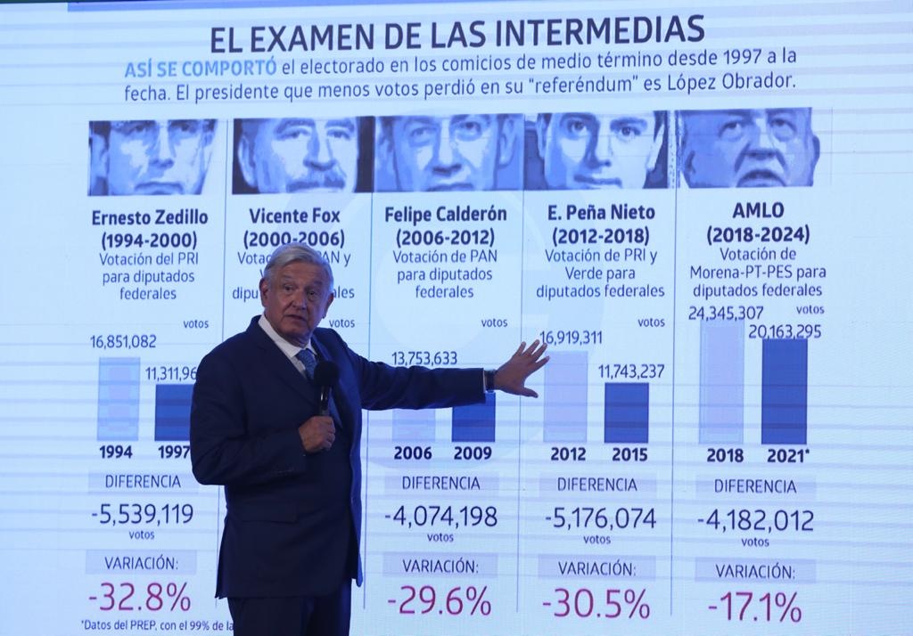 Presentó un cuadro comparativo respecto a ese declive en sexenios pasado: Zedillo obtuvo 32.8 por ciento menos, respecto de los sufragios alcanzados en la elección presidencial; con Fox, 34.8 por ciento menos; Calderón, 29.6 por ciento menos; Peña Nieto, menos 30.5, y López Obrador, menos 17.1 por ciento (al pasar de 24.3 millones de votos en 2018 a 20.1 millones en 2021).