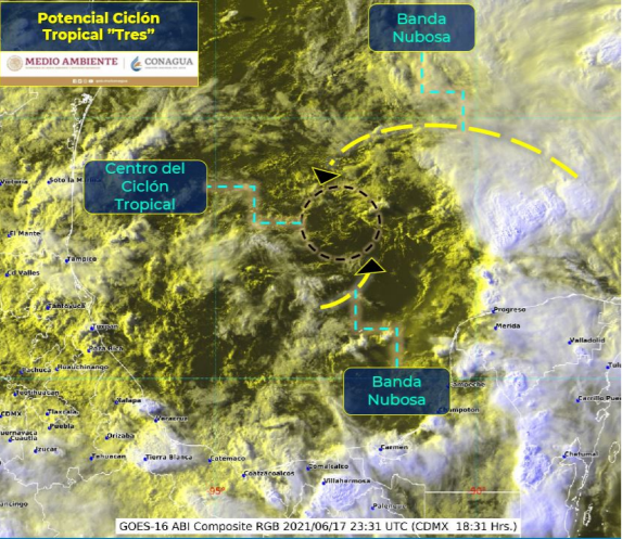 La Comisión Nacional del Agua (Conagua) informó en un comunicado este jueves 17 de junio, de la formación del potencial ciclón tropical Tres en el Golfo de México. Este sistema origina lluvias puntuales torrenciales en Oaxaca, Chiapas y Quintana Roo, lluvias puntuales intensas en Tabasco, Veracruz, Campeche y Yucatán y lluvias puntuales muy fuertes en Puebla.