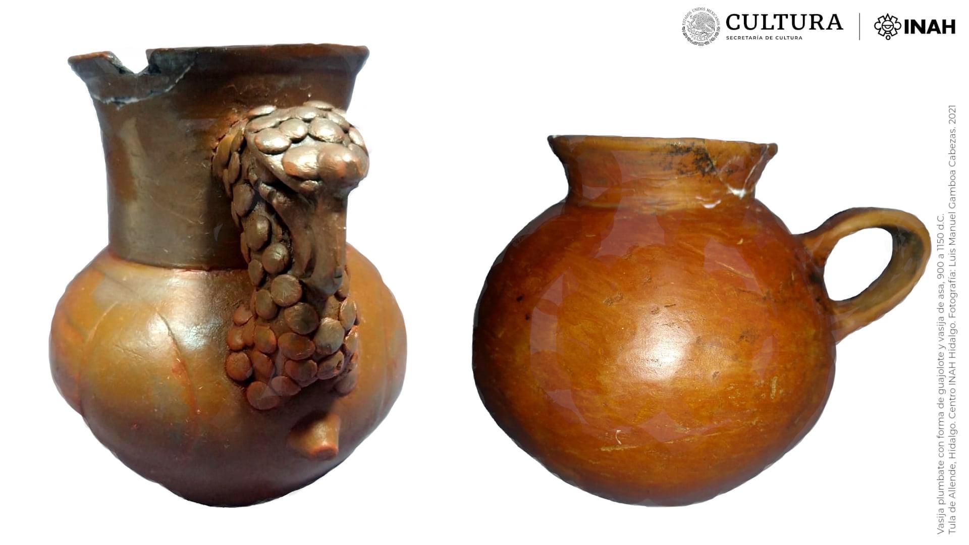 Una vasija con asa, un sahumador, un cajete rojo pulido y una vasija con forma de guajolote fueron hallados en el lugar del entierro.