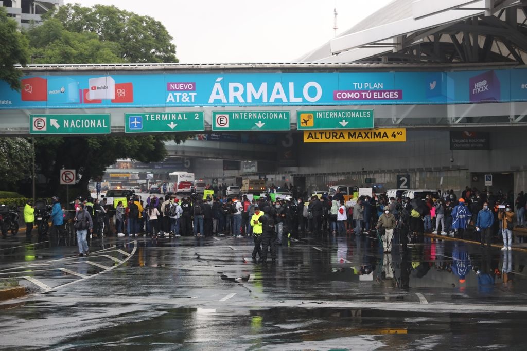 Los inconformes bloquearon la avenida principal de acceso a la terminal aérea. Policías capitalinos realizan cortes a la circulación de automovilistas.