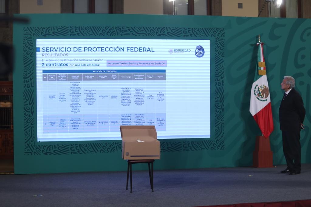 Ante López Obrador mostró la caja que contiene la documentación y que será entregada a la Fiscalía General para que investigue y localice a los responsables de “esta ilegal práctica que violó" la integridad de políticos, periodistas, luchadores sociales, empresarios, defensores de derechos, legisladores y servidores públicos.