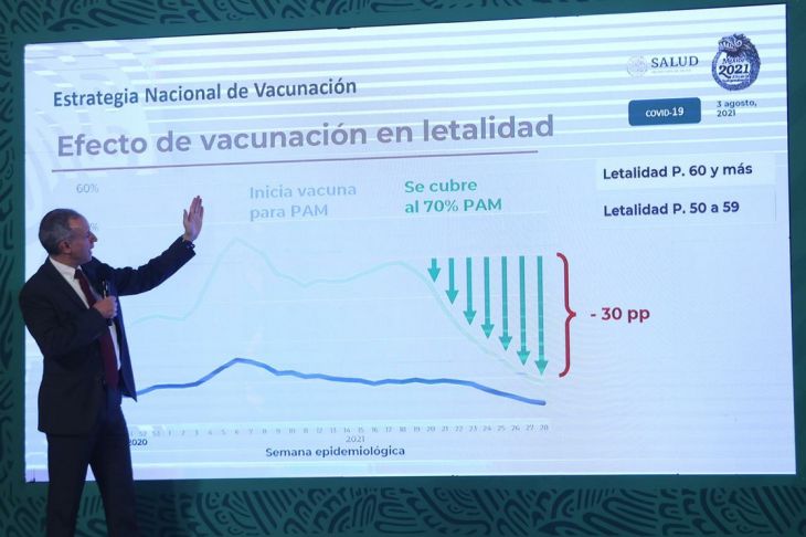 No obstante, a partir de la semana 18, cuando se alcanzó 70 por ciento de cobertura de la vacunación en población adulta mayor, se redujo la letalidad hasta 10 por ciento; una reducción de 30 puntos porcentuales. En el grupo de 50 a 59 años también se presentó una reducción semanas después, a partir de la semana 23.