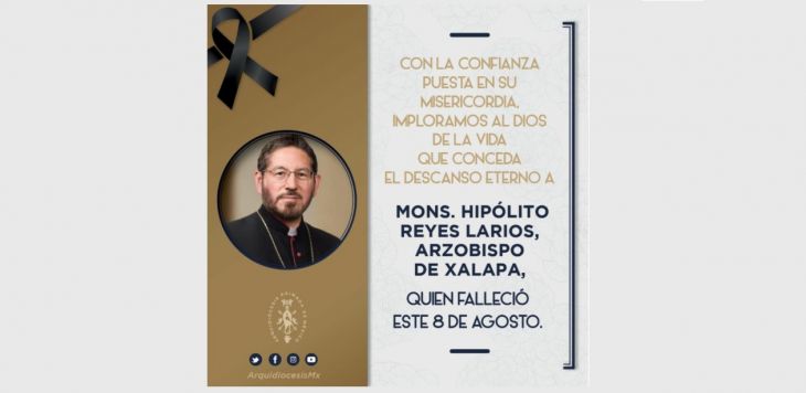“Lamentamos informar la triste noticia de que esta mañana, a las 8:40 de la mañana, víctima de una hemorragia interna, en un hospital de la ciudad de Xalapa, falleció el Arzobispo de Xalapa. Mons. Hipólito Reyes Larios”.