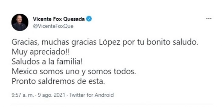 Fox manifestó: “Gracias, muchas gracias López por tu bonito saludo. Muy apreciado!! Saludos a la familia! México somos uno y somos todos. Pronto saldremos de esta”.