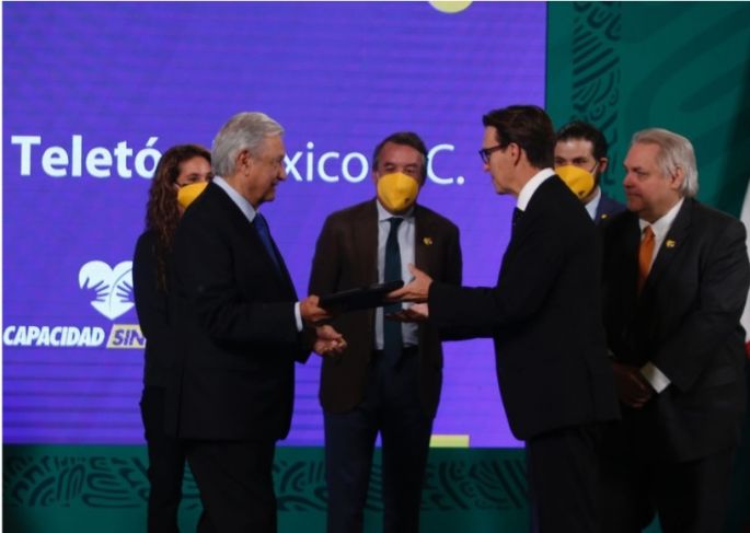 Durante la conferencia de prensa matutina de este jueves en Palacio Nacional, firmó el acuerdo el presidente de Teletón, Fernando Landeros; Emilio Azcárraga, presidente ejecutivo del consejo de administración de Televisa, y el empresario Carlos Bremer, como representantes del consejo de la fundación.