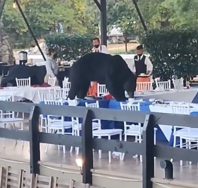 Mientras, los meseros del lugar observan al oso, alejados lo más posible del mismo.