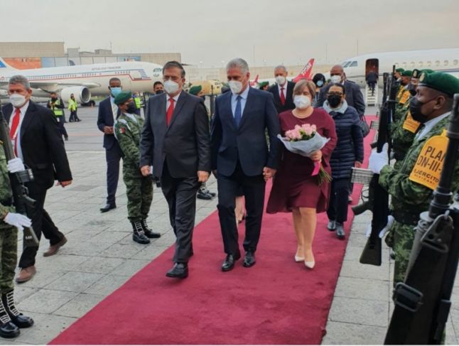 En el Aeropuerto Internacional de la Ciudad de México, el canciller Marcelo Ebrard recibió al mandatario cubano y a su esposa, Lis Cuesta.