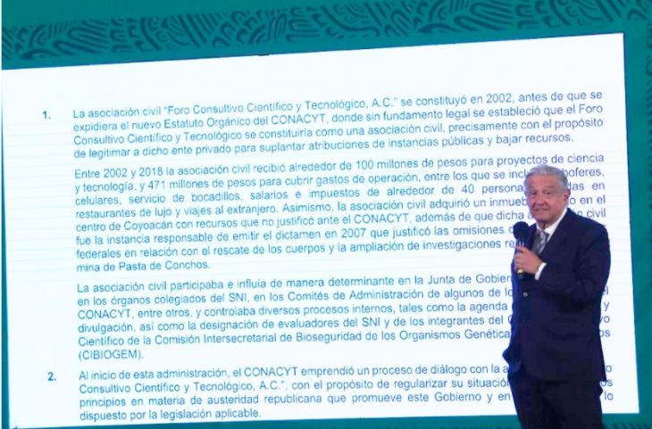Al dar a conocer en la conferencia de prensa matutina parte de un informe que le envió la directora del Consejo Nacional de Ciencia y Tecnología (Conacyt), María Elena Álvarez, el mandatario mencionó que el caso se refiere a un grupo de investigadores que formaron un especie de asociación civil que recibían dinero del Conacyt.