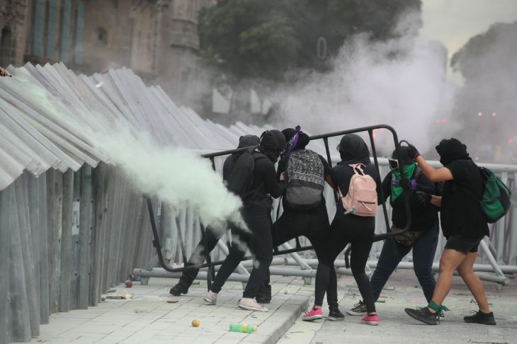 Al concluir la marcha convocada con motivo del Día de Acción Global para el acceso al Aborto Legal y Seguro, un grupo de feministas intentó llegar a los accesos de Palacio Nacional, quitando las vallas que lo protegían, lanzando cohetones y objetivos contundentes.