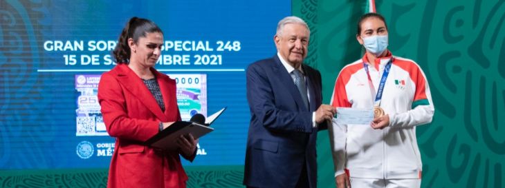 El presidente Andrés Manuel López Obrador entregó hoy estímulos a deportistas que participaron en los Juegos Olímpicos en Tokio 2020. Los fondos para realizar estos pagos se derivan de lo recaudado en el sorteo especial de la Lotería Nacional del pasado 15 de septiembre, cuyos premios fueron básicamente inmuebles decomisados a la delincuencia organizada.