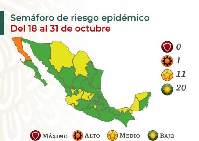 Del 18 al 31 de octubre, en riesgo bajo -color verde- estarán la Ciudad de México, el Estado de México, Nuevo León, Baja California Sur, Sonora, Sinaloa, Durango, Nayarit, Zacatecas, San Luis Potosí, Tamaulipas, Veracruz, Hidalgo, Puebla, Tlaxcala, Michoacán, Guerrero, Oaxaca, Chiapas y Quintana Roo.