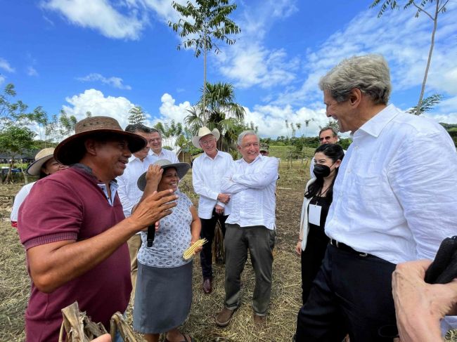 Sobre el terreno húmedo, donde se asienta un vivero de plantas de árboles maderables y frutales, el mandatario describió minuciosamente al enviado especial para el clima del gobierno estadunidense, John Kerry -acompañado del embajador de ese país, Ken Salazar-, las razones y resultados de uno de sus programas puntales: el Sembrando Vida, que contribuirá a enfrentar el fenómeno de la migración centroamericana en dirección a aquel país.
