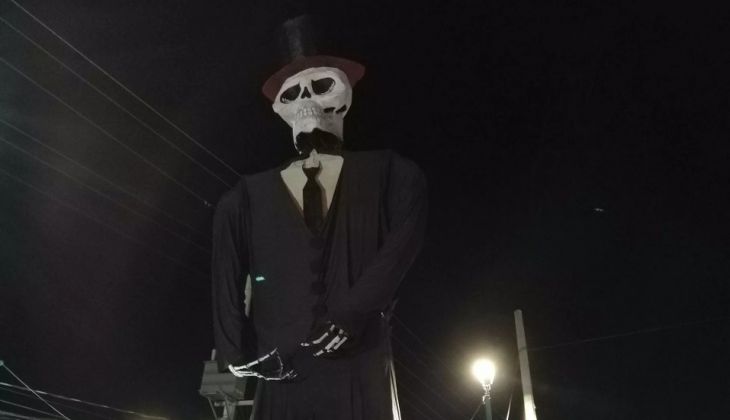 Una calavera monumental con sombrero de copa y acompañada por un xoloescuincle de luz recibe a los viandantes: es la entrada al paseo deambulatorio de Míxquic, uno de los barrios tradicionales de Tláhuac, en el sureste de la Ciudad de México.