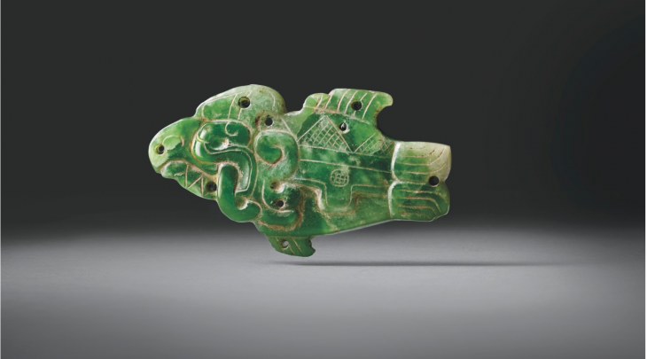 Un pendiente maya tallado en jade verde brillante, que aparece en la portada de esta nota, se subastó en 81 mil 250 euros, una cifra que ronda los 2 millones de pesos. “Este extraordinario colgante de pez ejemplifica los ricos adornos usados por los miembros de élite de la sociedad maya y mixe-zoque y durante los últimos siglos que conducen al Período Clásico”, describe Christie’s.