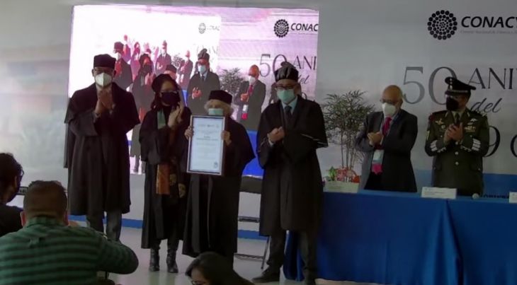 En el contexto de su 50 aniversario, el Instituto Nacional de Astrofísica, Óptica y Electrónica (INAOE) entregó este viernes, desde la comunidad de Santa María Tonantzintla, el doctorado honoris causa a la reconocida escritora y periodista Elena Poniatowska Amor (París, Francia, 1932), siempre ligada la historia del instituto al compartir su vida con Guillermo Haro, uno de los fundadores y directores de esa institución.