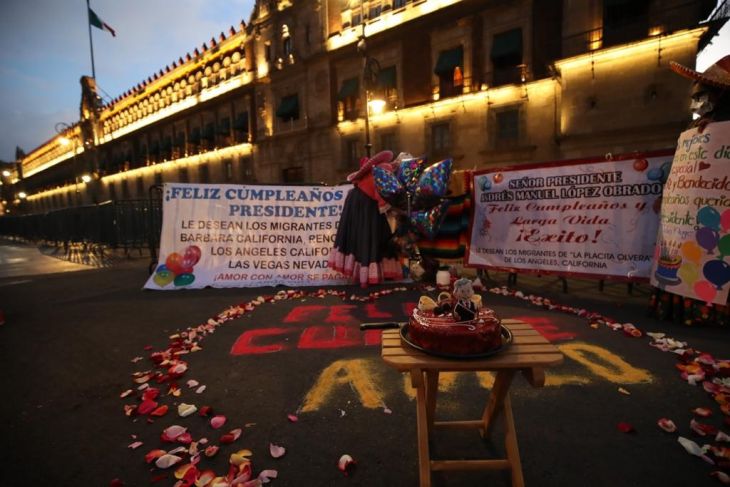 Cerca de 50 personas se reunieron desde las primeras horas de este sábado frente a Palacio Nacional para celebrar el cumpleaños número 68 del presidente Andrés Manuel López Obrador, con bandas musicales, arreglos florales y globos, con los cuales manifestaron su apoyo al mandatario.